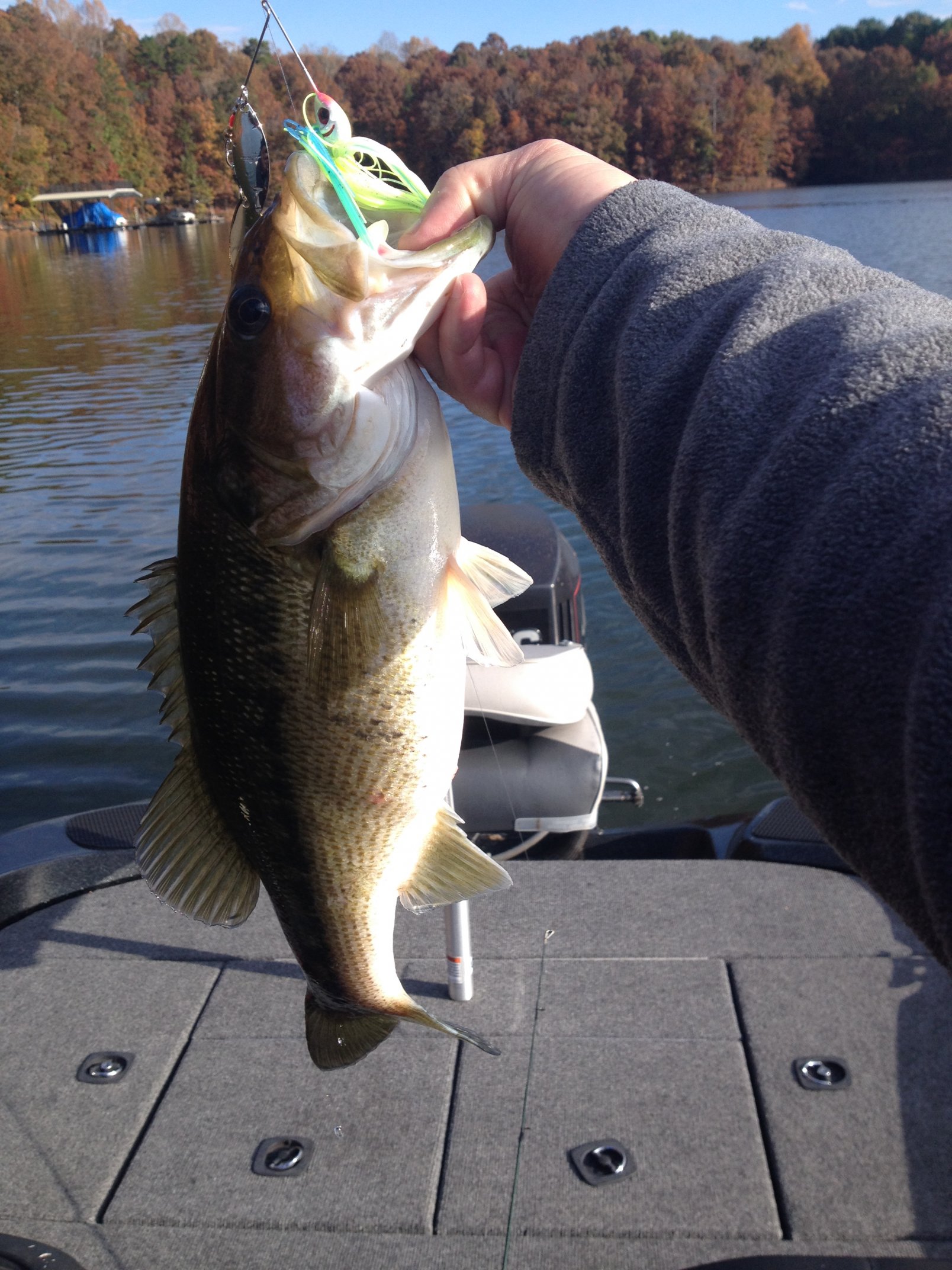 I've been on lake sidney lanier the last two weekends and the water temp is steady at 65-66°. the fish have been hitting a spinner bait and cranks. most of mine are on a booya 3/8 oz. I dont know the color but look in the pic. Its been chilly in the morning. last week it was down around 32. Thats dang cold to me but I know some of ya'll are from up north. |
