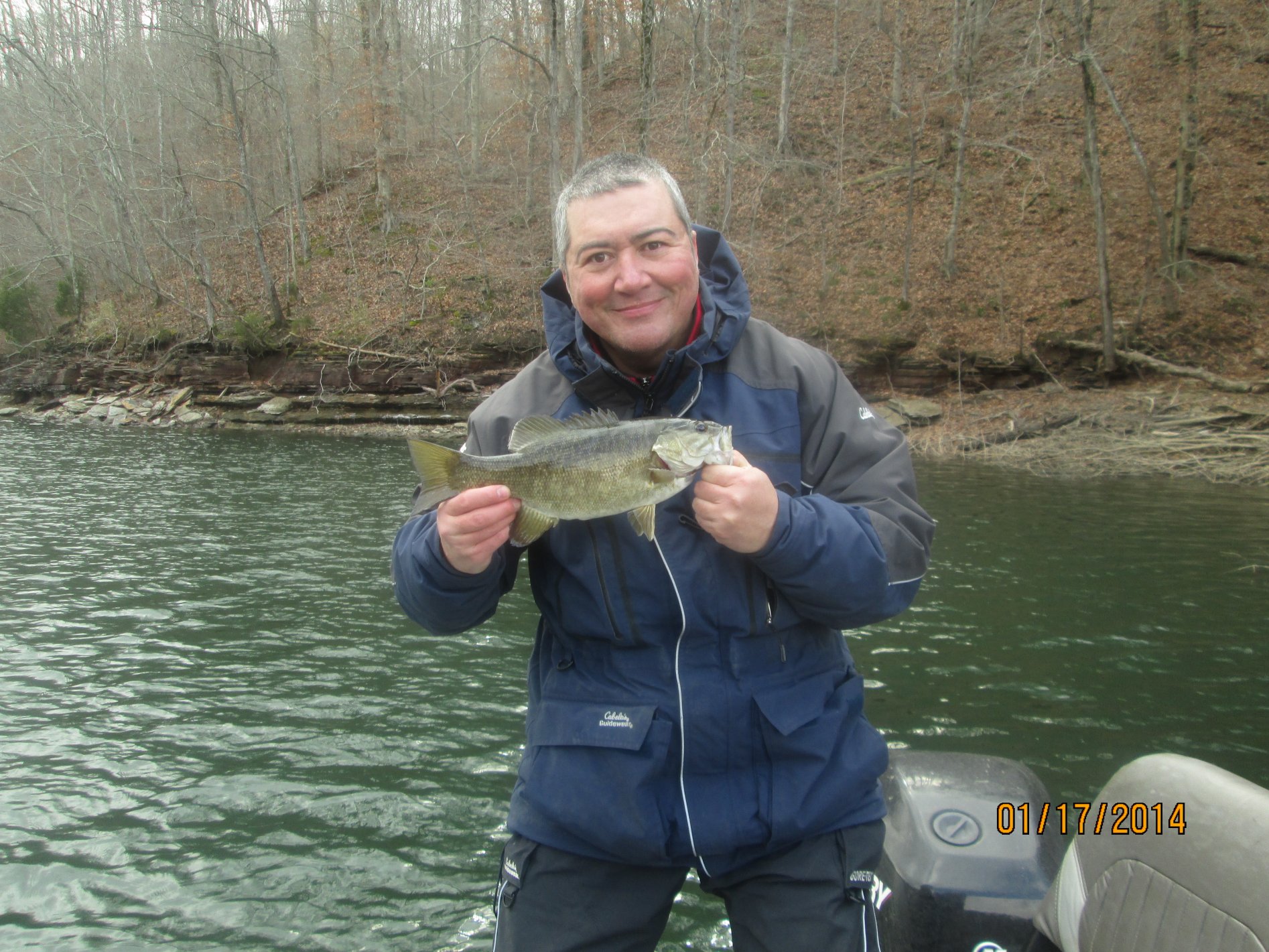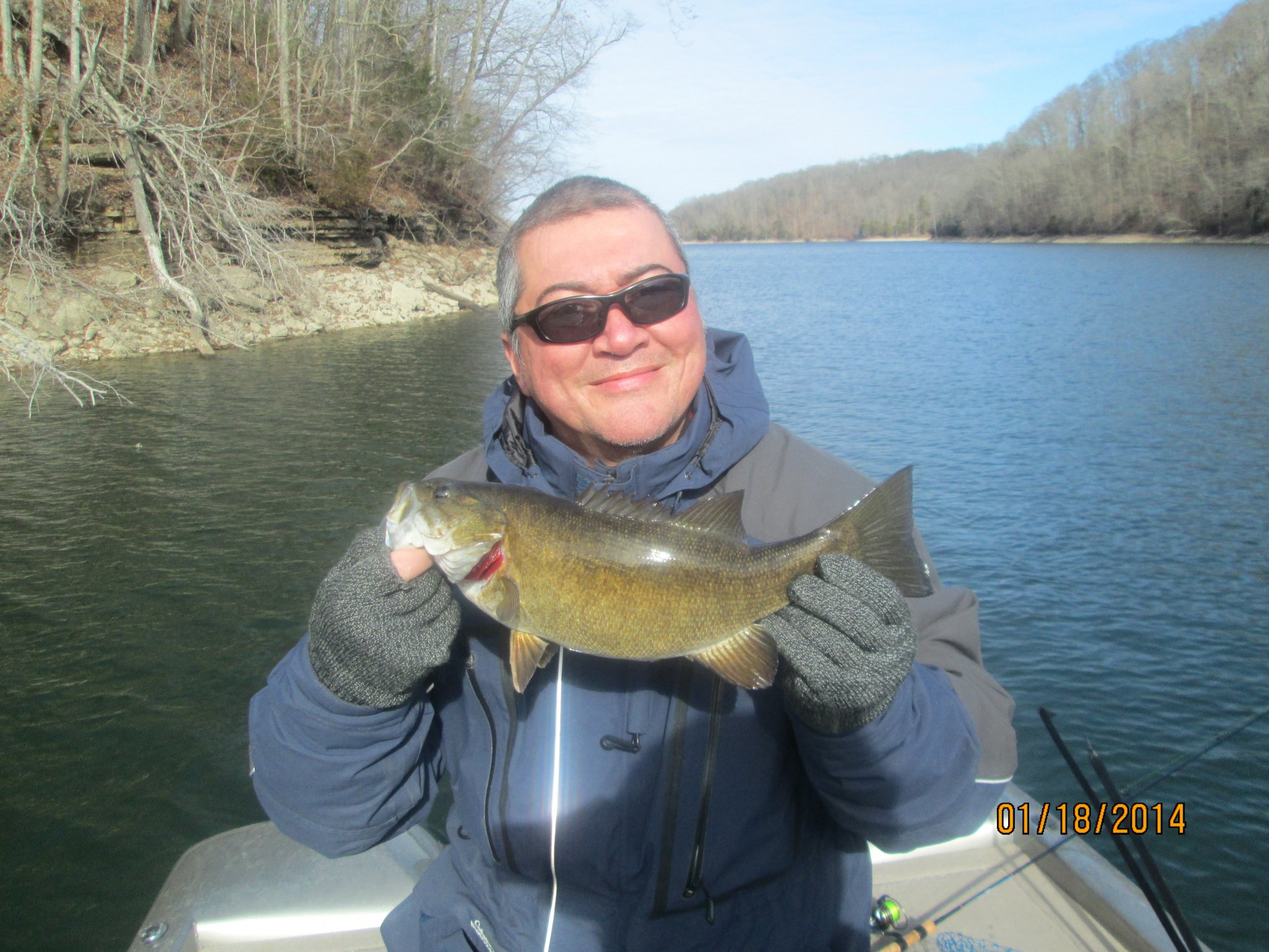 I met my buddy with his boat from Evansville Indiana at Cedar Hill's boat ramp this past Friday morning just before sunrise, with mostly cloudy skies, and a fast moving Alberta Clipper bearing down on us. It did seem as if the conditions were ideal for smalljaw fishing. We decided to head south to a no name creek next to the restricted cove belonging to the ACOE, to look for bait and found none. We then idled along the bluff wall heading toward the restricted area and the dam, looking for bait and finding none. We also looked for bait around the mouth of Dale Hollow Creek and Horse Creek with no baitballs to be found. So then my buddy had a couple of spots over in Indian Creek that he wanted to check out. At first we didn't notice any baitfish in the area, but we decided to go ahead and fish a secondary point that had produced fish for him in the past. After spending close to 30 minutes there with nothing to show for it, we decided to make a move, and what a move my buddy decide to make, all the way to Long Branch we went, through one heck of a snow squall blowing out of the south sideways right into our faces. I'm glad I made the investment of buying a full face motorcycle helmet; it was money well spent. After searching Long Branch with no sign of bait, we decided to head over to Lick Run, all the while checking main lake structure for bait and finding none. After putting in about 4 hours searching for bait we finally were able to find multiple baitballs at about a depth 9' to 10', in a secondary creek, with mostly cloudy skies. We caught two within 40 yards of each other back in the pockets, one brownfish being a 14" under and another 16" slot. Conditions: Water temp. 45, mostly cloudy skies, steady 15mph wind out of the SW with 20+ mph gusts, 9' leader with duck feather Chart. and purple fly. The next day conditions, before mid=afternoon,: mostly sunny skies, 8 - 10mph winds out of the SW. We located bait back in Indian Creek near a secondary point, and managed to catch 3: 2 brownfish @ 17" and 1 healthy spotted bass 18", off the some productive secondary point. I was using a 13' leader under a bobber with the same colored fly. Considering that this was only our second FNF trip, I considered it to be a success, but ONLY after putting in the TIME searching for baitfish. |