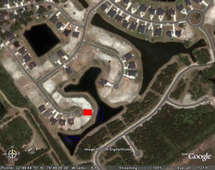 the blue parts are the areas where ive hooked moderate sized bass. the red box is my house. do any of yall have any tips of any other locations in that chain of ponds that might have good sized bass. i know they are there in the ponds because ive seen people pull em out and ive seen some monster bass when they come to the shallows every now and then.