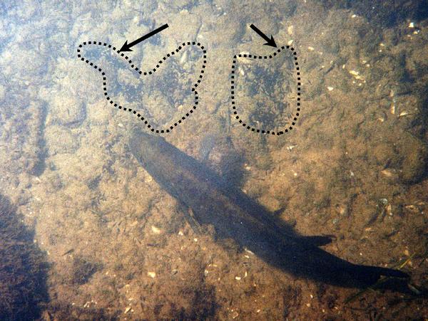 Anyone else have any techniques to share on bedding bass? Heres a male smallie guarding the egg embryo's That I have circled |