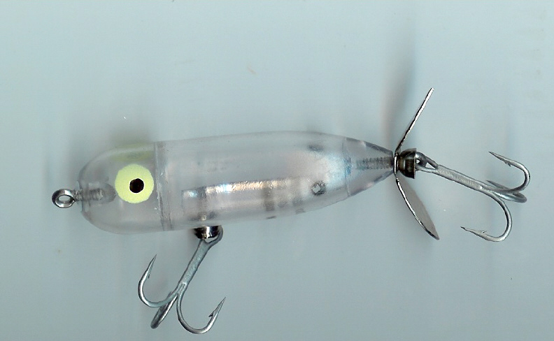 I'd like to find some #5 size trebles (SOMEBODY makes 'em!) to see if the added weight might still allow the lure to float and operate properly, or at least place a #5 on the rear of the lure. BTW, "Clear" is my favorite "lack-of-color" for clear-water lakes. I painted the prop red on one, and it seems to do no harm, at least, LOL! I own a Baby Torp or two, but can't remember the last time I used one. For a prop bait larger than a Tiny Torp, I prefer a Devil Horse or one of the rare and discontinued PICO Slashers or a (also discontinued, I think,) Heddon Dying Flutter. The PICO...http://blog.so-net.ne.jp/_images/blo...on/2076430.jpg The Flutter...http://www.ifish.net/sfdtyflutt.jpg I always removed the front prop. FlyRod |