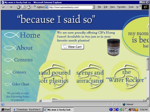i work on websites and could'nt help but notice you have a spacing problem on your website..if you are using the W3org webpage builder, and you know how to insert HTML coding, you need a space tag between some of your words in the following to make it fit the screen a name="description" content="My Mom is Becky Bait Co. is a website built by fishermen for fishermen. We are a hand-poured plastic bait company based in Des Moines, IA. My Mom is Becky Bait Co. specializes in soft plastic baits like nanny beavers, the trickster, daddy long-legs, uncle sinko, lil' pedey, etc." /> <meta name="keywords" content="walleye, fishing, fish, tackle, plastics, my mom is becky bait co, my mom is becky, becky, baits, bait, My Mom Is Becky, mymomisbecky, Bait, Baits, nanny beaver, uncle sinko, lil' pedey, the trickster, daddy long-legs, grandpa curly, Nanny Beaver, Uncle Sinko, Lil' Pedey, The Trickster, Daddy Long-Legs, Grandpa Curly, becky bait, Becky Bait, Becky Mom, becky mom, Bass, bass, walleye, Walleye, Smallies, smallies, Smallmouth, smallmouth, Because I said So, because i said so, Lures, lures, lure, Lure, hand-poured, Hand-Poured, hand poured, Hand Poured" /> <script type="text/javascript"> You can polish up the webpage by inserting space tags inbetween the long run of keywords and descriptons... by placing a <p> before a section, followed by a </p> after the desire section...its trial and error at first, but when done you can see all the words that are missing on the right side of the page... hope that helps ya! JB I am betting you are viewing it on Netscape, but for the general windows explorer gang out there, the appearance is different |